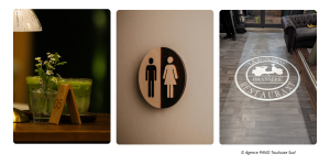• Parcours client fluide : Des pictogrammes clairs ou des panneaux directionnels permettent de localiser facilement l’accueil, les toilettes ou les zones privatisées.