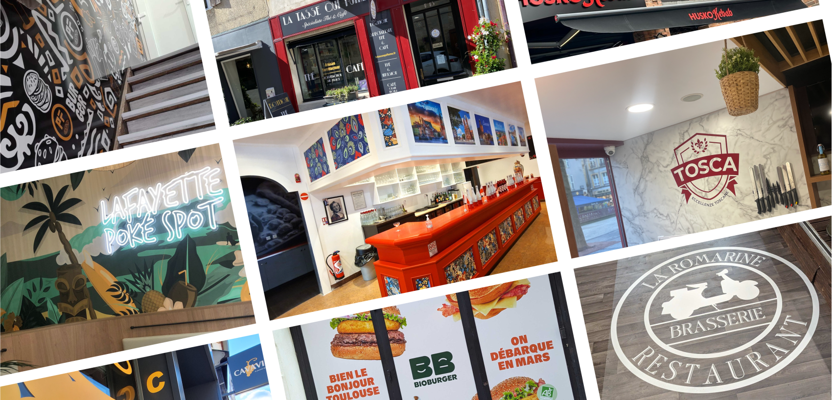 • Habillage vitrine restaurant : Affichez vos horaires, vos menus ou vos spécialités avec élégance. Le lettrage adhésif ou le vinyle dépoli apportent du cachet à vos vitrines tout en communiquant l’essentiel.